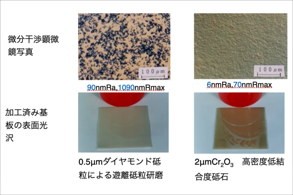 1980年代においては、粒径が数µm~サブミクロン程度のダイヤモンド砥粒を用いたラッピング・ポリッシングが中心であり、加工面粗さは数十nm~百nmレベルでした。