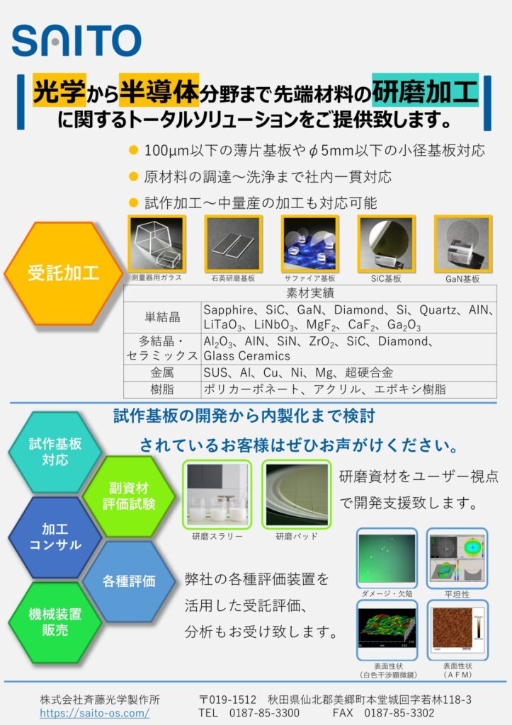 弊社は、1977年より光学・電子部品用ガラス基板の研磨加工企業として技術を蓄積し、現在は酸化物単結晶、サファイア、パワーデバイス向けSiC、GaN、Diamond等、更なる難加工材料分野において事業を展開させて頂いております。